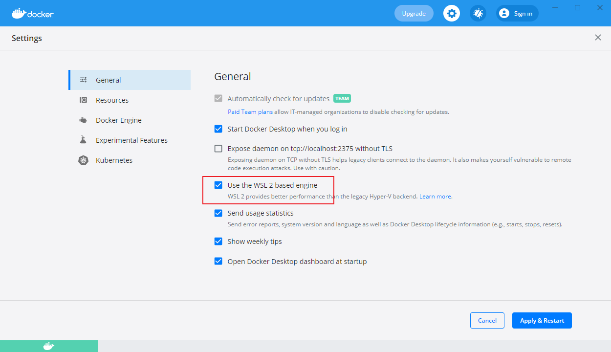 打开 Docker 的设置, 查看截图中红色框的复选框是否选中,如果选中说明启用了WSL2。